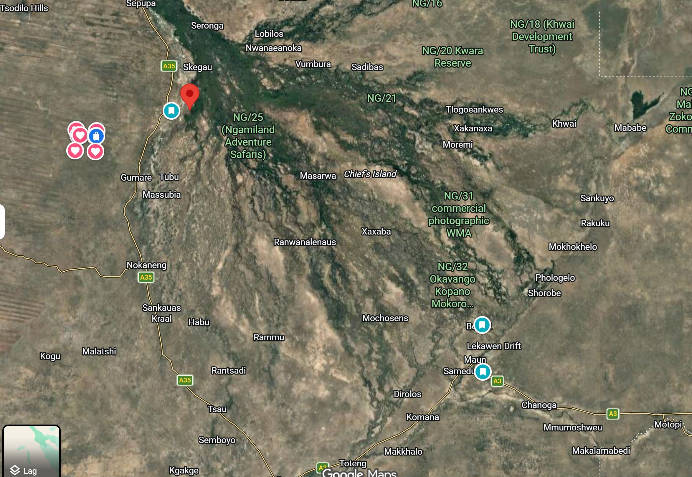 Der findes forskellige lodges og campsites i Okavango delta. Denne lokalitet er godt placeret fordi de er tæt på Gumare, hvor der ikke er så mange lodges. Der kan fx laves en camp/lodge i prismæssig mellemklasse – flere af de eksisternde lodges er ekstremt dyre 300-1000 USD pr. nat. Der mangler et alternativ til disse lodges i området. Her kan man selv køre næsten til lodgen – man har bare en kort sejltur over til øen, så er man i Okavango paradis! Et absulut mageløst sted.